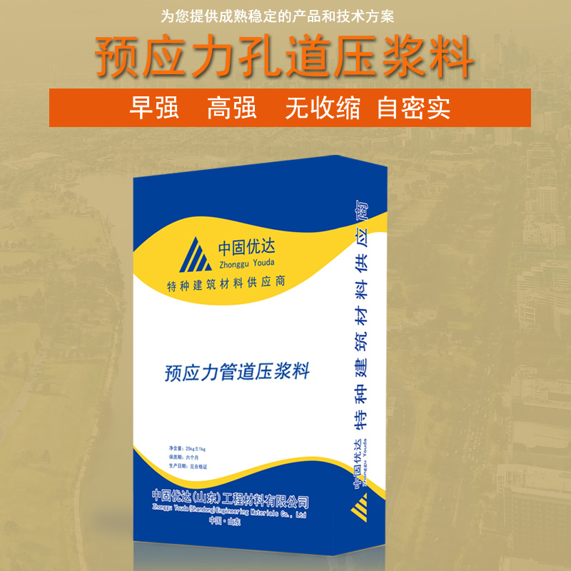 預應(yīng)力管道壓漿料簡稱壓漿料,是由優(yōu)質(zhì)水泥基材料、減水劑、微膨脹劑、礦物摻合料配制而成,具有良好的流動性,不泌水,不離析,無收縮、微膨脹,強度高,抗?jié)B抗凍、抗腐蝕、粘接度高、綠色環(huán)保等特點,不含氧化物、氯化物、亞硫酸鹽和亞硝酸鹽等對鋼筋有害組份,產(chǎn)品廣泛應(yīng)用于鐵路橋梁、公路橋梁、核電站等大型工程的預應(yīng)力結(jié)構(gòu)孔道灌漿的施工;各種砼結(jié)構(gòu)接頭處止漏灌漿;空隙填補或修復;地面錨固壓漿、設(shè)備基礎(chǔ)壓漿、底板注漿、梁柱節(jié)點、工程搶修等用途。